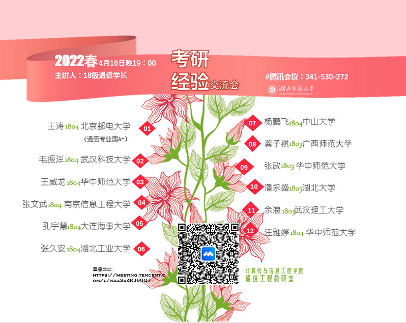 2022年研究生考试工作已经落下帷幕,计算机与信息工程学院2022届考研成果喜人。为进一步加强同学们对研究生入学考试的认识,了解前沿的就业形势,增强考研斗志。4月16日晚19:00,计信学院通信工程教研室通过腾讯会议组织召开线上“考研经验交流会”,邀请学院2022届12名优秀学子作为嘉宾分享考研经验。