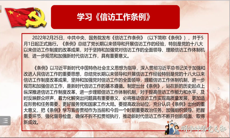 (通讯员 吴琪琪 2022-6-21)为深入学习习近平总书记最新重要讲话精神,计算机与信息工程学院学生党支部于2022年6月21日12时30分在腾讯会议开展了“党员干部下基层,师生群众得实惠”六月主题党日活动。与会人员有计算机与信息工程学院第一党支部书记冯欣老师以及学生党支部全体党员。