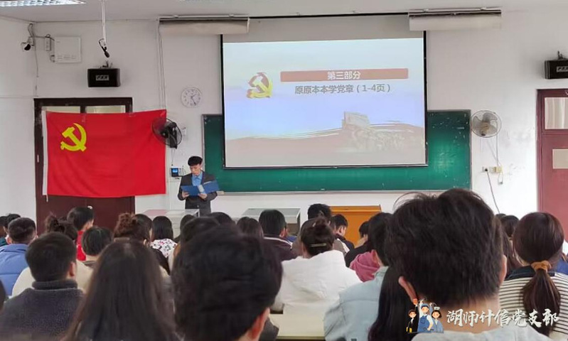 会议伊始,王颖涵同志带领全体党员重温入党誓词。会议第二项,交纳党费,由周晓琦同志汇报党费收缴事宜。会议第三项,原原本本学党章,由李星宇同志带领全体同志集体诵读《中国共产党章程》中第一页至第四页的内容。会议第四项,由梁薇同志带领大家学习《习近平谈治国理政》第四卷。会议第五项,微党课“认真学习贯彻党的二十大精神”,张泽龙同志带领大家学习中国共产党第二十次全国代表大会的精神,深入学习报告内容以及伟大的建党精神。会议第六项,围绕学习内容,党员谈体会,黄家建同志和简文静同志依次分享了学习心得。