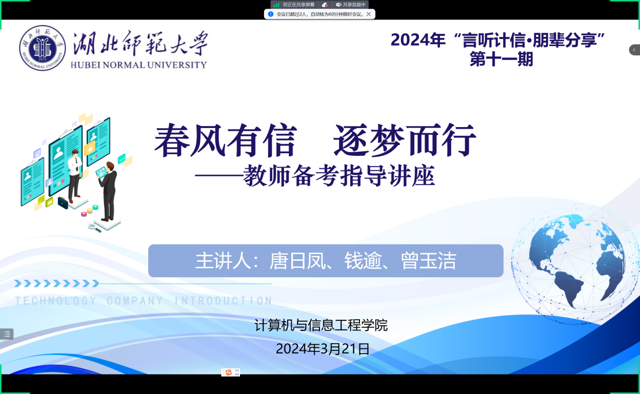3月21日晚,计算机与信息工程学院举办2024年“言听计信·朋辈分享”第十一期主题为“春风有信 逐梦而行”教师备考指导讲座。学院邀请了教育技术学专业唐日凤、钱瑜、曾玉洁三位优秀毕业生分享了自己教师备考经验,计算机与信息工程学院2020级部分学生线上聆听并踊跃提问。辅导员卢老师主持讲座。