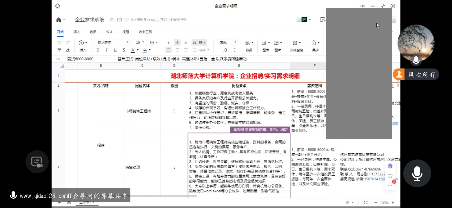根据前期联系,4月14日,卢梦与计科系2000级校友田胜祥在线上与杭的10余企业进行联络,双方就毕业生的实习就业、岗位人员素质要求和岗位人员匹配进行了沟通,共同希望更多的毕业生能够不断挑战自己,自我历练,提升自我。此次外访累计联系就业岗位近50余个。