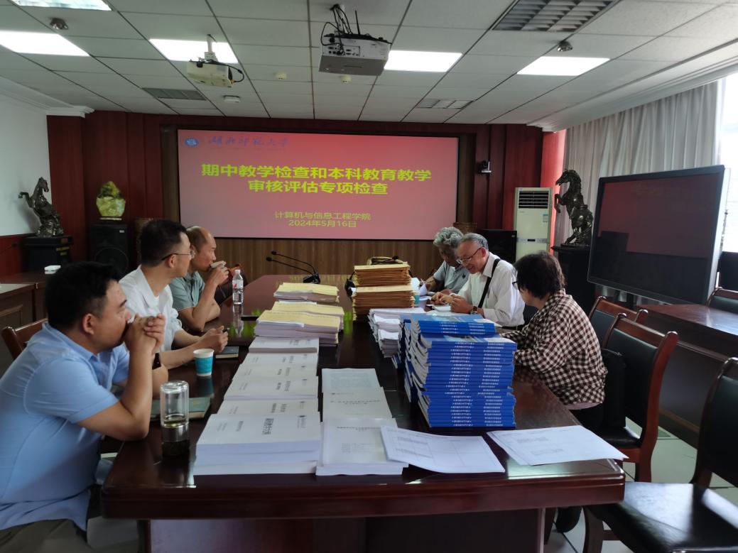 2024年5月16日下午,计信学院在1715会议室开展期中教学检查和本科教育教学审核评估专项检查工作。教务处副处长龚波、教学督导吴瑞霞教授、李福安教授、叶良明老师、化学学院许月明老师一行来我院对期中教学工作和本科教育教学审核评估工作进行专项检查。学院党委书记王舒怀、副书记刘健、副院长童强、副院长陈琦以及系主任、专业负责人、办公室主任、辅导员、教学秘书、科研秘书、教学督导、骨干老师参加了本次会议。