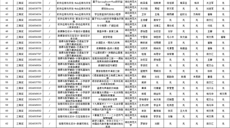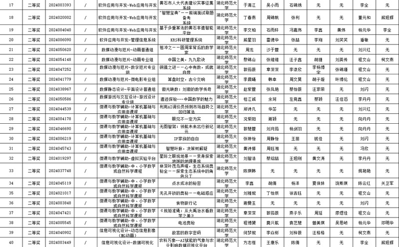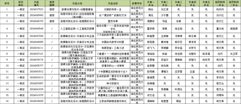在学校教务处和学院领导的支持下,我院共74个作品参加2024年中国大学生计算机设计大赛中南地区赛(湖北和湖南各高校),一共覆盖了比赛11个大类中的9个大类,包含大数据应用、计算机音乐创作、人工智能应用、软件应用与开发、数媒动漫与短片、数媒静态设计、数媒游戏与交互设计、微课与教学辅助和信息可视化设计。其中62个作品获得奖项,含16个一等奖、24个二等奖和22个三等奖。一等奖中的数媒动漫与短片中的动画作品《刘徽的传奇一生》、信息可视化设计中的MG动画作品《会“摆姿势”的象形文字》和信息图形设计作品《星历华章》获得参加国赛资格。具体获奖情况如下: