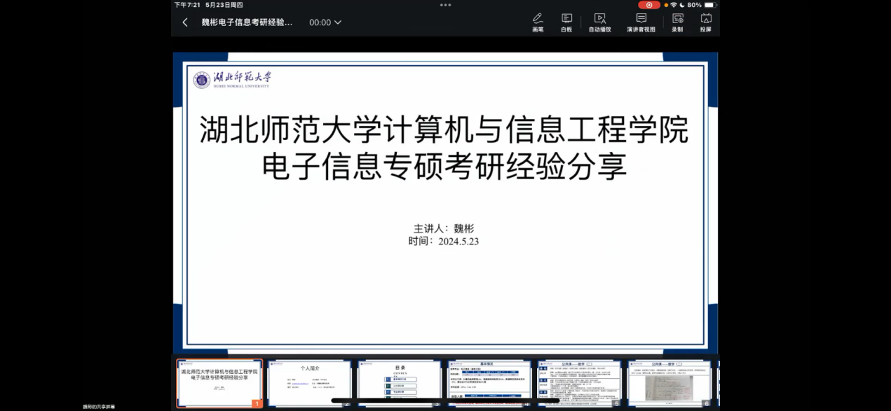 2024年5月23日晚,计算机与信息工程学院举办2024年第十四期“言听计信·朋辈分享”考研经验分享会。学院邀请了2024年拟录取为不同层次院校不同专业研究生李佳、魏彬、严观伟、周玮琪、杨晓静、陈银挺6名同学分享自己研究生备考经验,计算机与信息工程学院21级、22级部分学生线上聆听并提问。辅导员卢老师主持分享会。