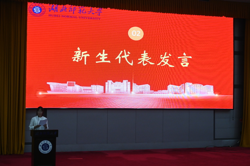 计信2408班的徐悠阳同学作为新生代表作了表态发言。她首先向学院老师及学长学姐的关心与迎新服务表达了感谢,进入美丽的湖师校园,对未来充满了向往和好奇,代表全体新生表态将以更加饱满的热情、更加坚定的信念、更加务实的作风,践行湖师大“诚、毅、谨、敏”的校训,将其内化于心,外化于形,为学校和国家贡献自己的力量!