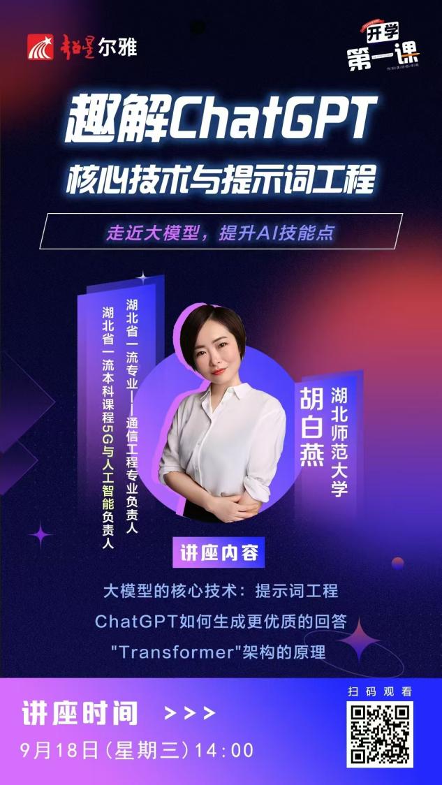 本次讲座定于9月18日(星期三)14:00,主题为“趣解ChatGPT核心技术与提示词工程”,胡白燕副教授作为湖北省一流本科课程5G与人工智能的负责人、湖北省一流专业通信工程的负责人,多次指导学生参与全国竞赛获奖 ,并主持多项省部级以上教研项目。