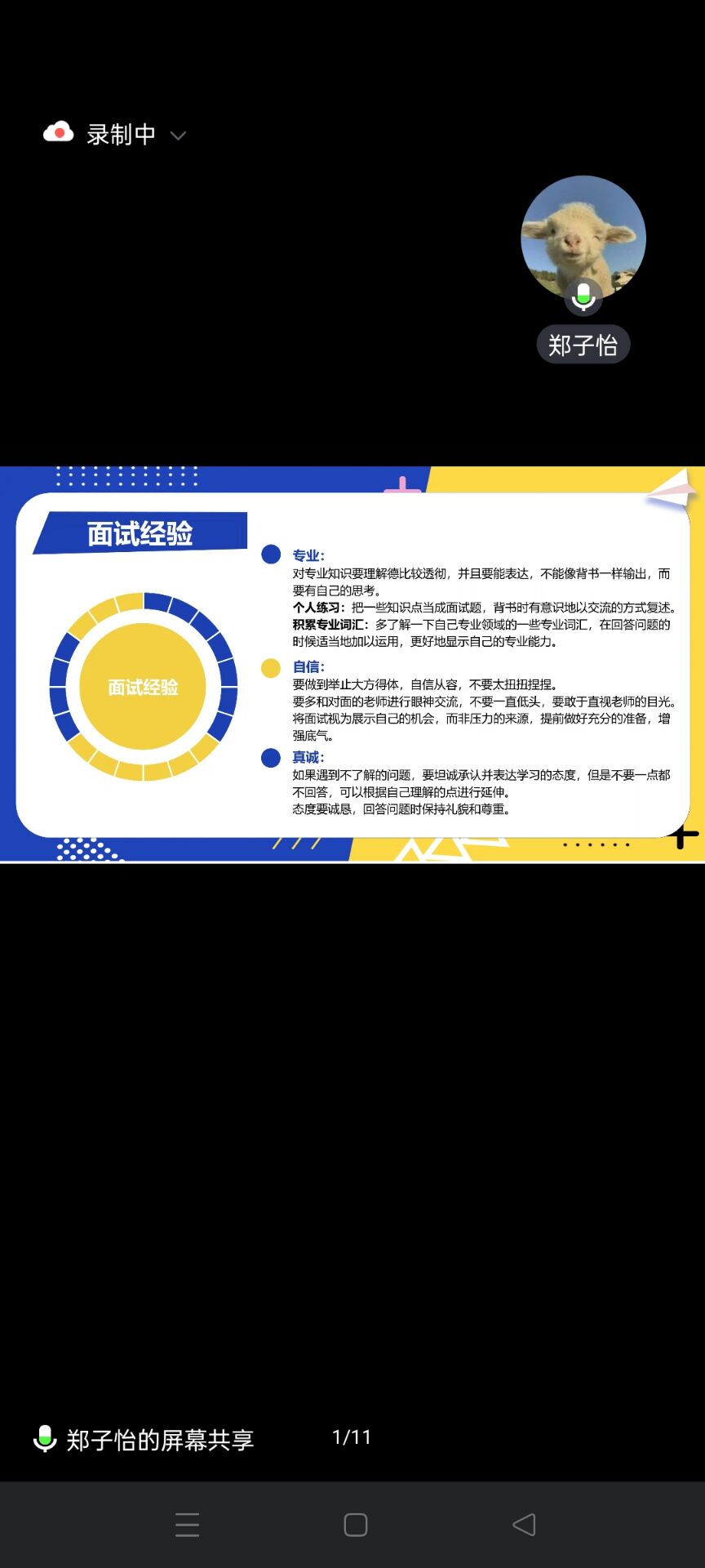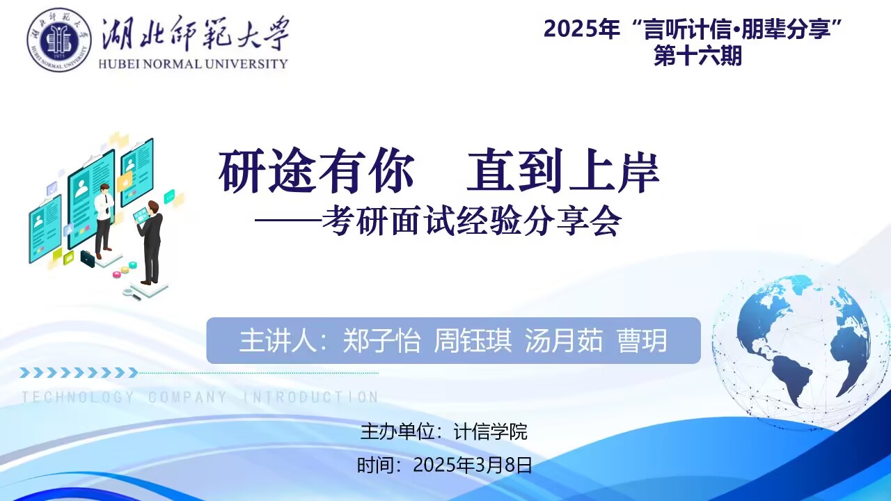 (通讯员 李颖 2025-3-8)为助力我院考研学子顺利通过面试,更好地实现深造梦想。3月8日晚6时计算机与信息工程学院在线上举办了第十六期“言听计信,朋辈分享”考研面试经验分享会。分享会邀请了四位去年上岸不同院校不同专业的优秀学子郑子怡、周钰琪、汤月茹、曹玥作为主讲人,辅导员卢老师和近100名学生参加。