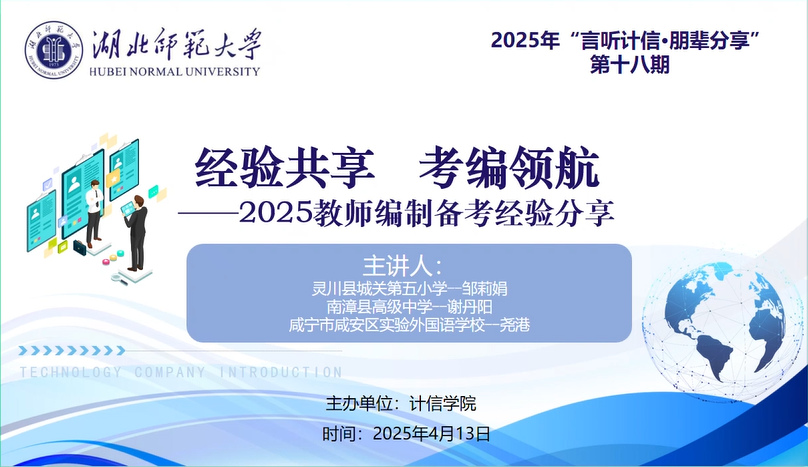 (通讯员 郭文婕2025-4-13)为助力我院学子科学备考教师招聘考试,实现职业发展目标,计算机与信息工程学院于4月13日晚6时30分线上举办2025年“言听计信·朋辈分享”第十八期活动。本期主题“经验共享,考编领航”教师备考经验分享会,特邀教育技术学专业三位优秀毕业生邹莉娟、谢丹阳、尧港担任主讲,辅导员卢老师及近100名学生参会。
