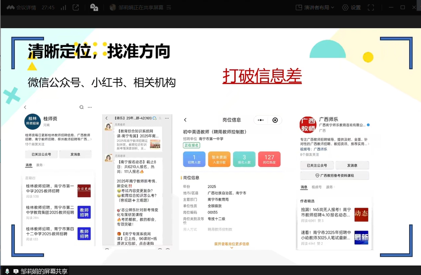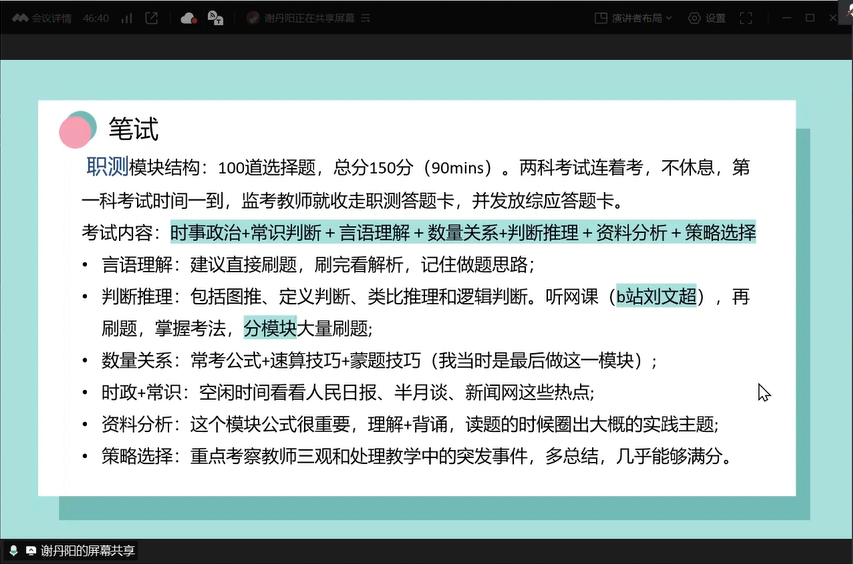 分享会伊始,主持人对到场同学表示热烈欢迎,并简要介绍了本次分享会的流程和目的。随后,主讲人依次进行经验分享,结合自身的备考经历,分享了教师招聘类型,笔试准备,面试试讲、说课、结构化等大家关心的问题。邹莉娟介绍了信息收集和选岗的重要性以及笔试备考、面试准备的注意事项;谢丹阳分享了考试流程、笔试答题技巧以及面试着装建议,进行了模块分析;尧港着重强调了面试自信的重要性、分享了获得和展示自信的方法。