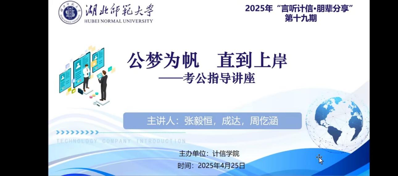 (通讯员 徐筱涵2025-4-25)为充分发挥我院优秀学子的榜样引领作用,助力在校学生深入了解国家公务员考试,掌握科学备考方法,4月25日19时,计算机与信息工程学院在线上举办了第十九期“言听计信,朋辈分享”公务员国考备考经验分享会。分享会邀请了2024年国考上岸的成达、周仡涵和张毅恒作为主讲人,辅导员卢梦老师及近100名学生参会。