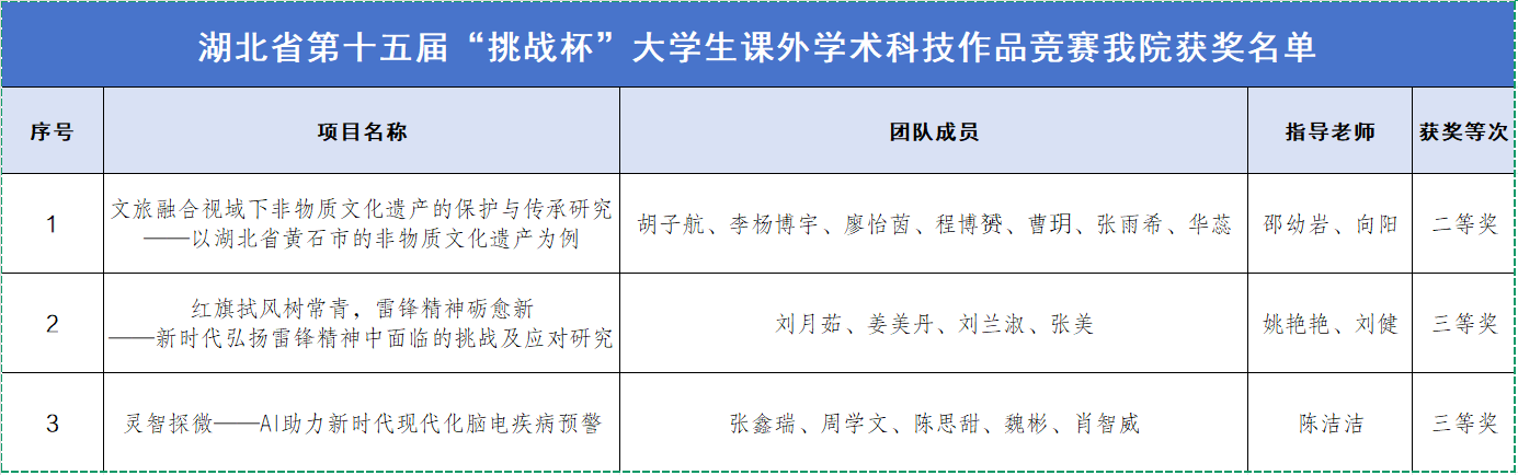 近日,由共青团湖北省委、湖北省科学技术协会、湖北省教育厅、湖北省学生联合会主办的“创新湖北·青力青为”湖北省第十五届“挑战杯”大学生课外学术科技作品竞赛决赛在湖北大学顺利落下帷幕。我院省赛参赛的3个项目均获奖,其中,二等奖1项、三等奖2项。