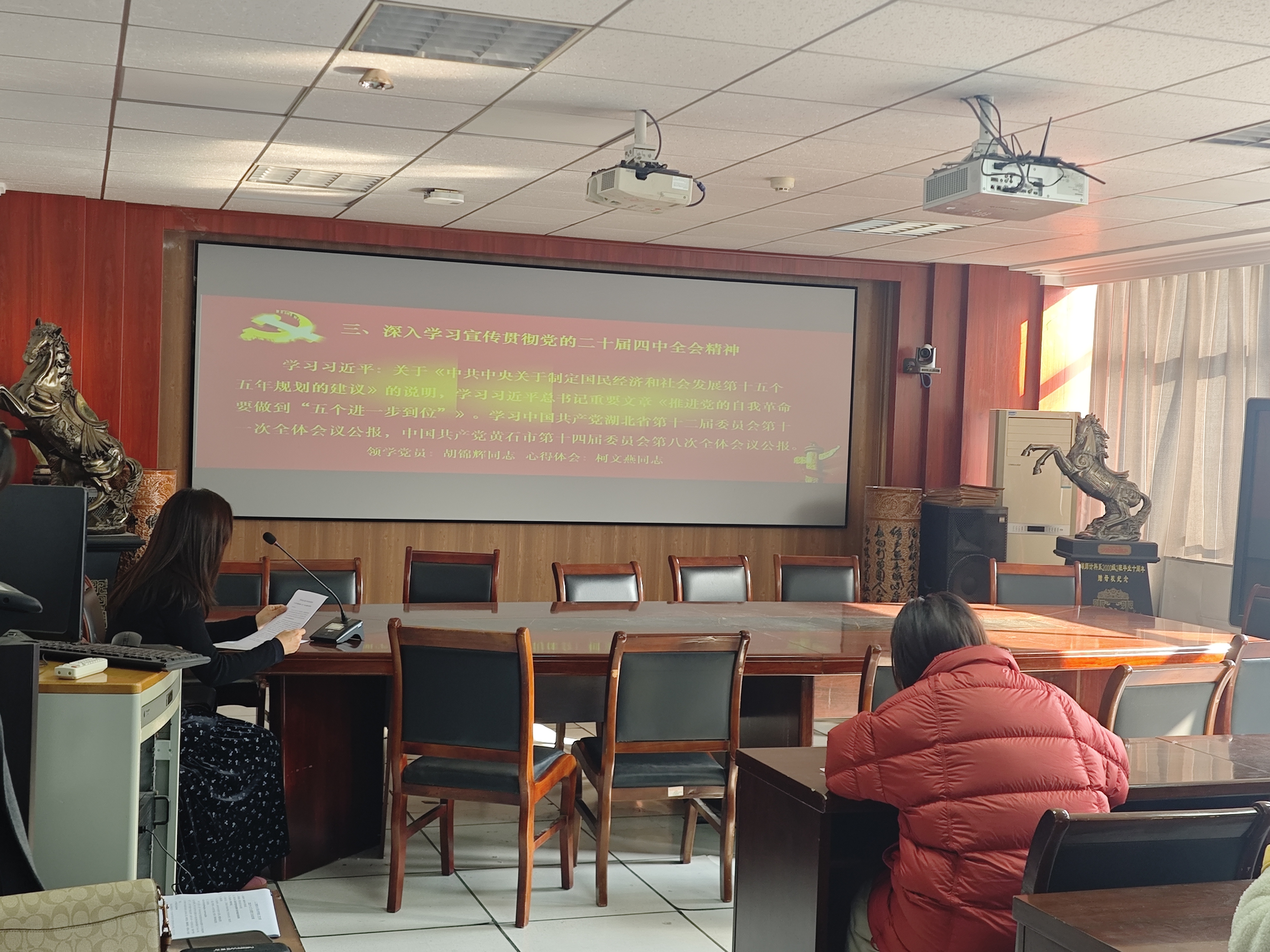 全体党员交纳党费,邓明华同志带领全体党员重温入党誓词。胡锦辉同志领学了习近平总书记关于《中共中央关于制定国民经济和社会发展第十五个五年规划的建议》的说明,以及习近平总书记重要文章《推进党的自我革命要做到“五个进一步到位”》。柯文燕同志做了题为“学深悟透全会精神 践行教育报国使命——学习贯彻省委十二届十一次全会精神心得体会”和“立足教育本职 服务区域发展——学习黄石市委十四届八次全会精神心得体会”的汇报。