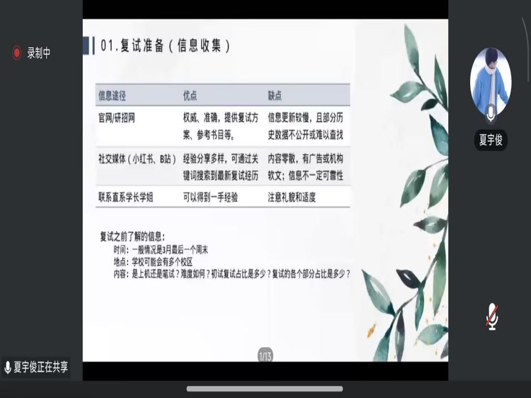 此次活动帮助备考同学及时掌握考研复试流程与备考策略,进一步增强了应试信心与规划意识。通过细致讲解与经验分享,同学们对复试环节的考察重点有了更清晰的认识,也更加明确了下一阶段的复习方向。与此同时,学院也通过目标院校在读研究生一对一联系指导准备参加复试的同学。相信融洽的朋辈引领与的交流氛围中,将有更多备考同学科学备战、沉稳应考,以扎实的专业素养和良好的心态迎接挑战,顺利圆梦理想院校!